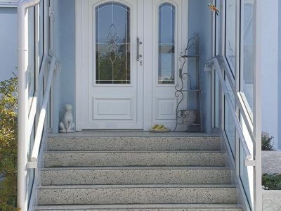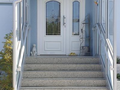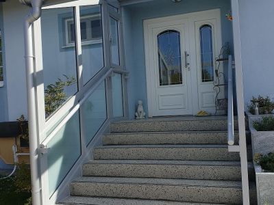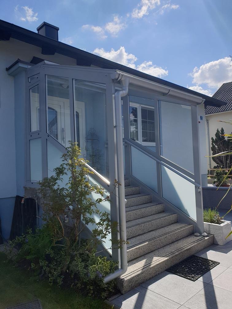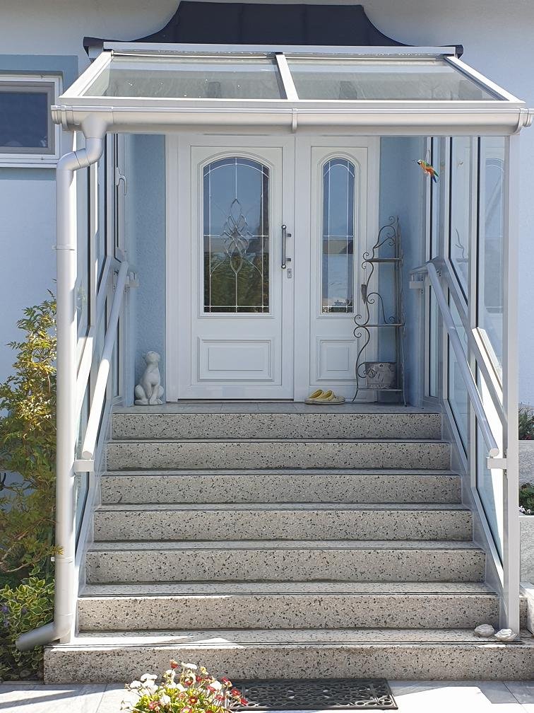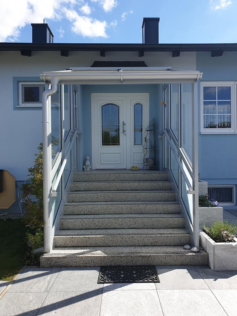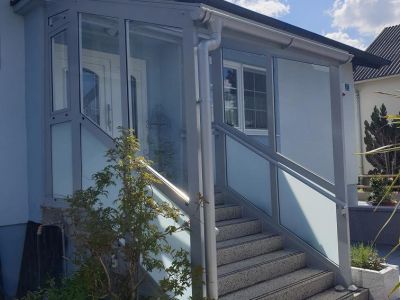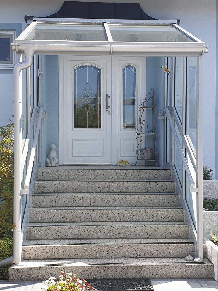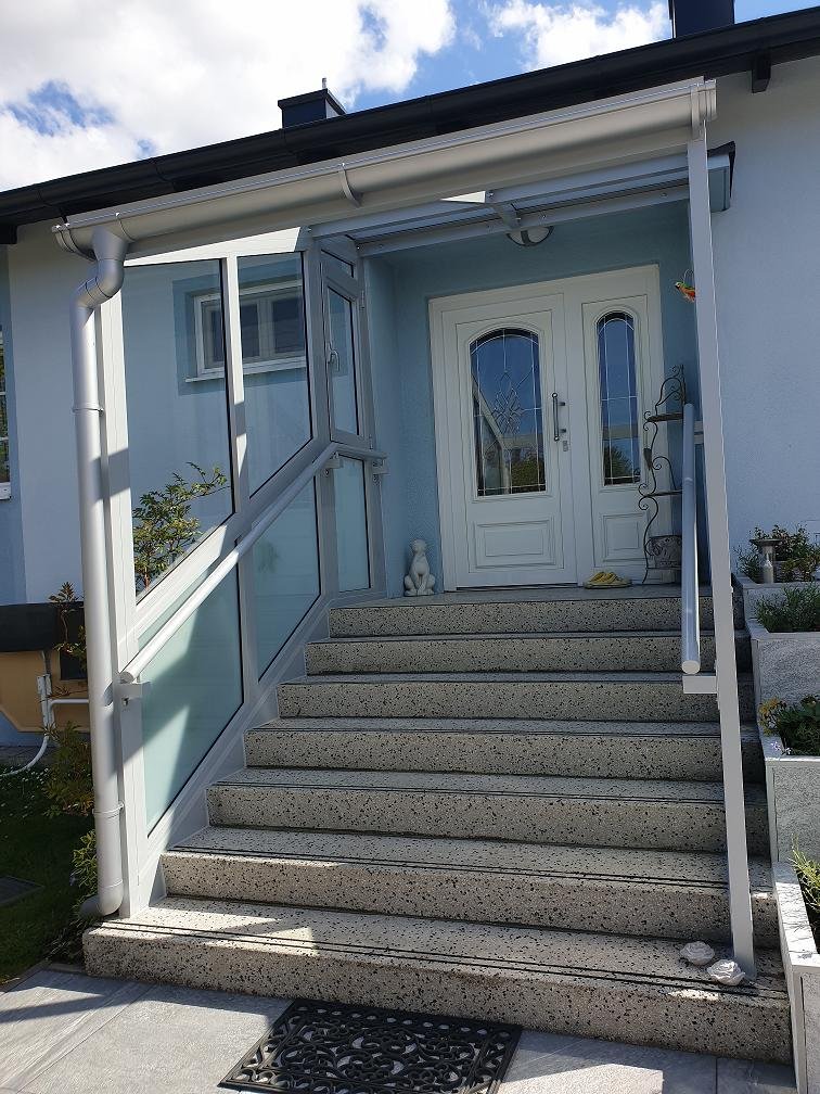 Aluminium Überdachung mit Aluminium Seitenteil, und mit Handlauf.