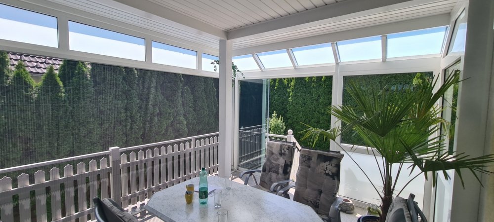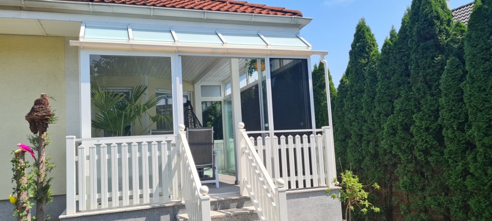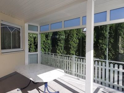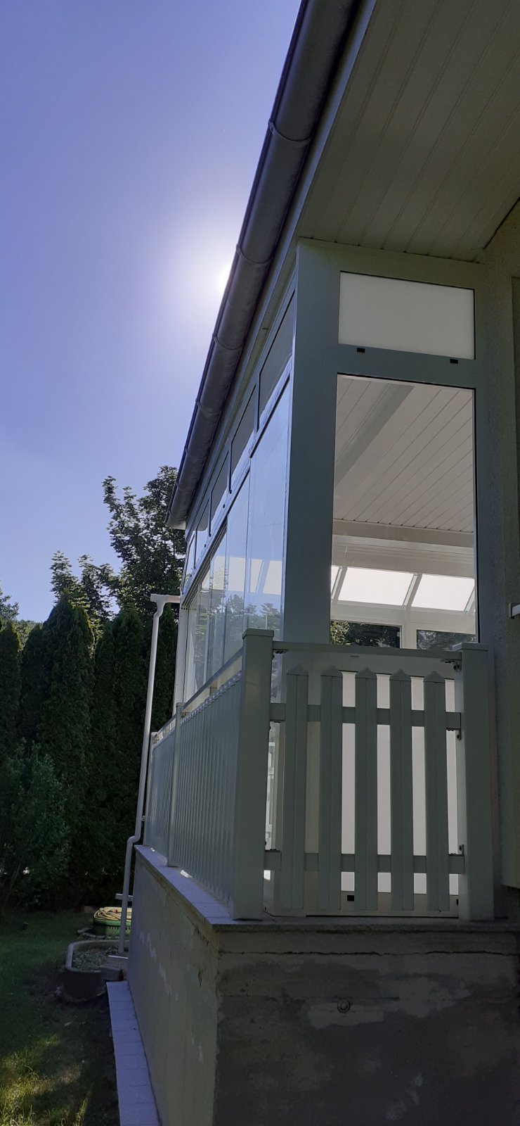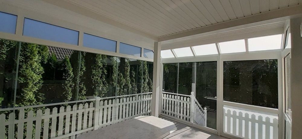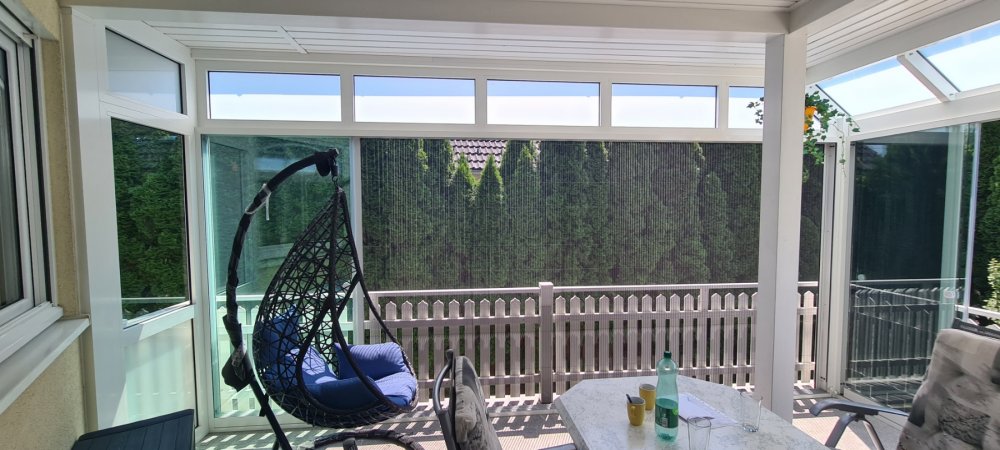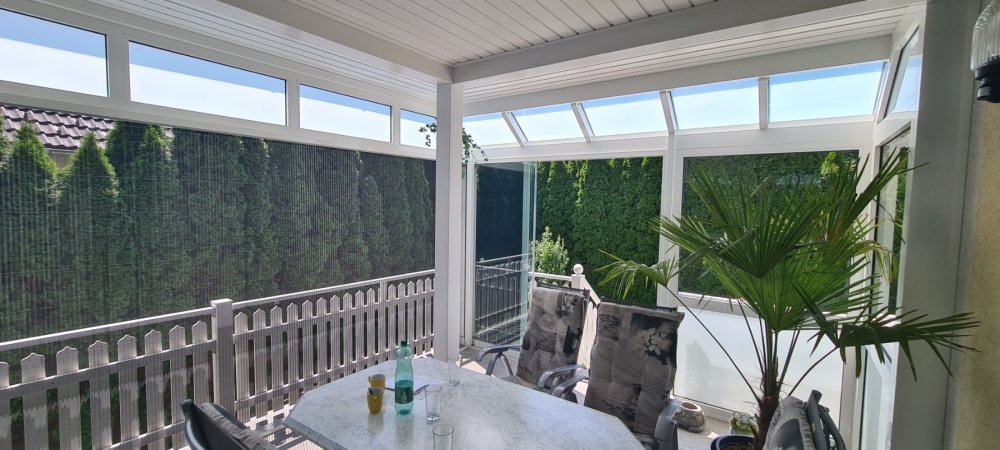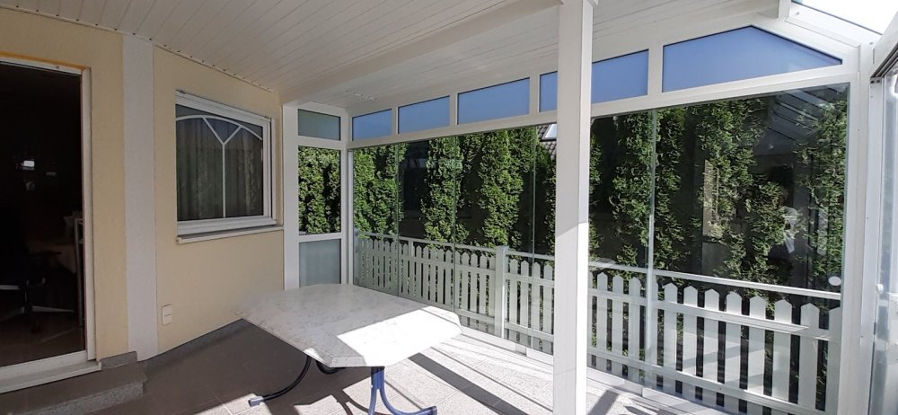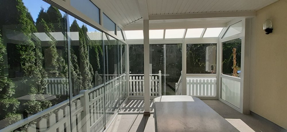 Auf diese Terasse wurde ein spezielles Sommergarten geplant.  Zuerst wurde eine Überdachung mit satinierte Sicherheitsverglasung ausgeführt mit eine kleinere Dachausladung. Das Ziel war den Innenraum zu erweitern und in weiteren die mögliche maximale Höhe für die Nurglas Schiebetüren zu erreichen. Auf eine Seite wurden Aluminium Fixverglasungen eingebaut damit wir auch hier die gewünschte Höhe haben. Die weiteren Seiten wurden mit den Nurglas Schiebe Anlagen verbaut , die man ganz einfach betätigen kann und so kann die Terasse offen oder geschlossen sein vom Wetter abhängig. Dank der modernen Pulverbeschichtungsprozess sind sogar unterschiedliche Farbtöne möglich und so findet jeder die Farbe die am besten zu der Terasse ,Haus oder Garten passt. In diesem Fall hat sich unser Kunde für die traditionelle  weisse Farbe sich entschieden .