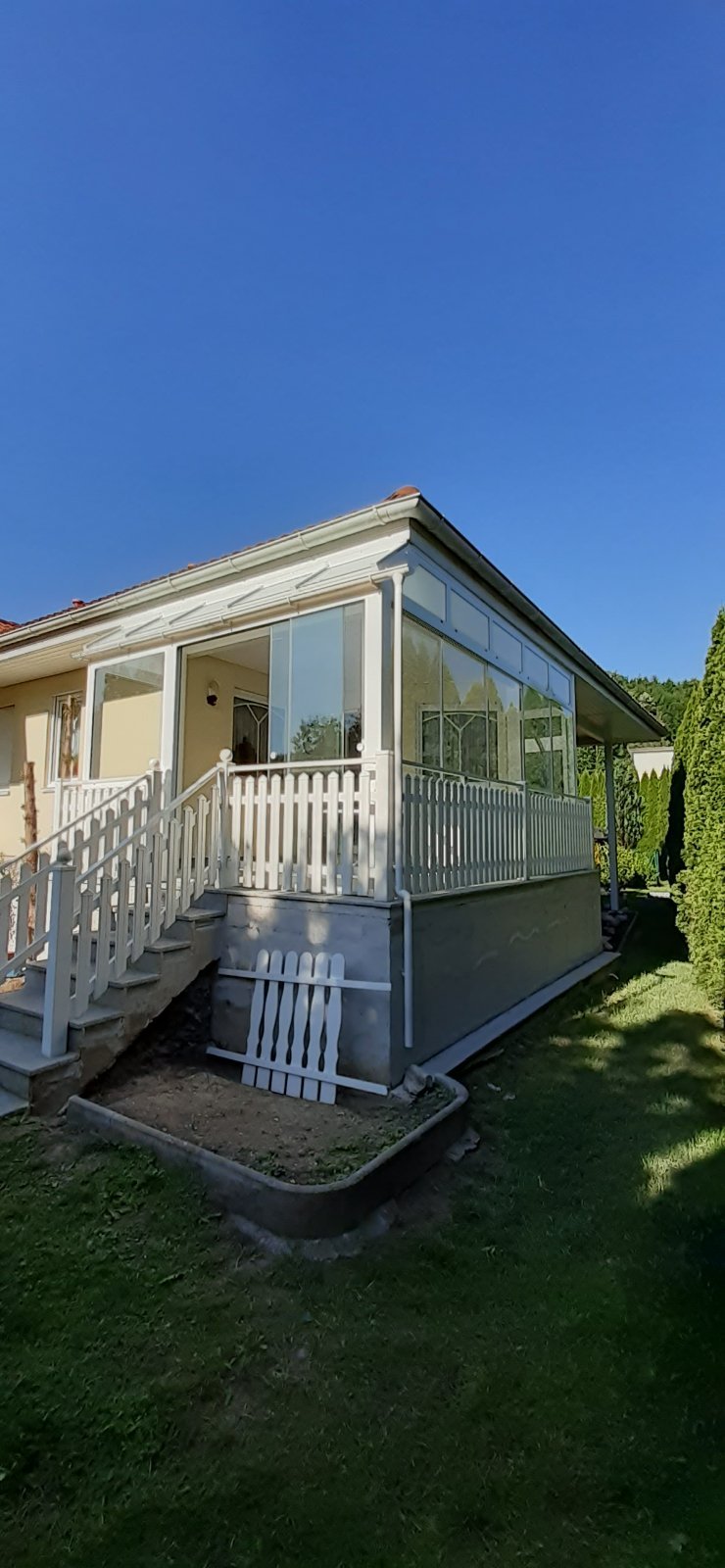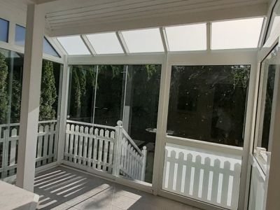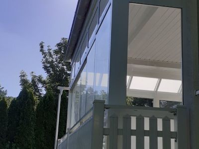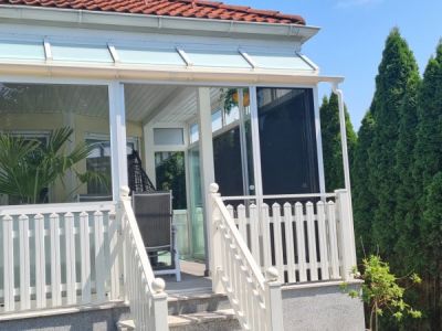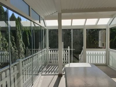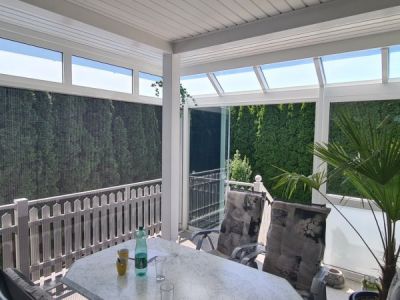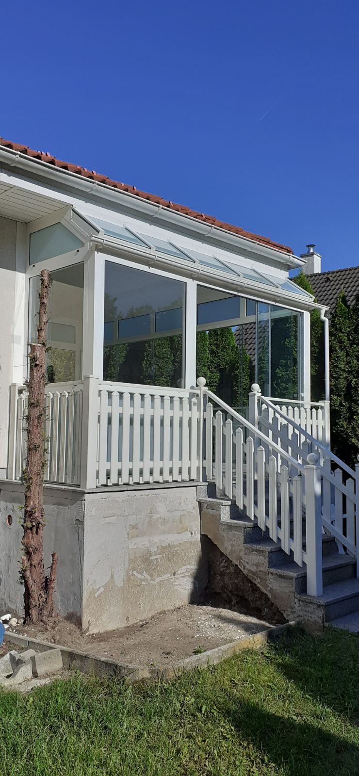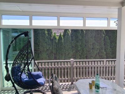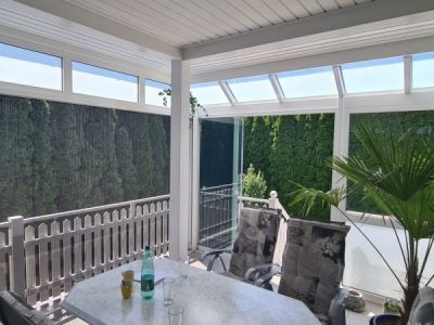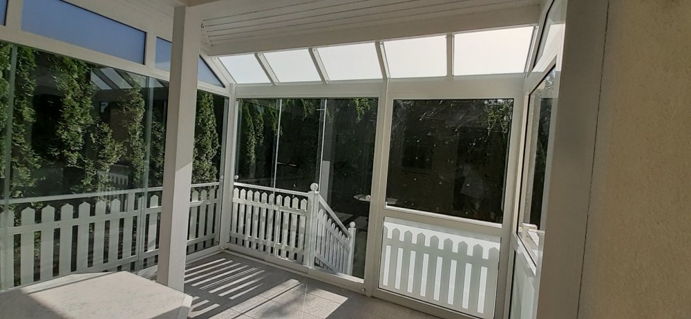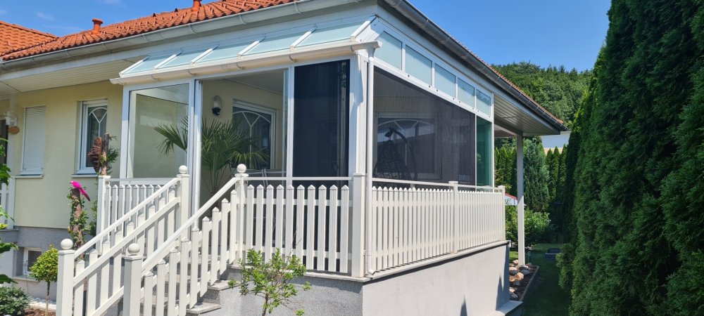 Auf diese Terasse wurde ein spezielles Sommergarten geplant.  Zuerst wurde eine Überdachung mit satinierte Sicherheitsverglasung ausgeführt mit eine kleinere Dachausladung. Das Ziel war den Innenraum zu erweitern und in weiteren die mögliche maximale Höhe für die Nurglas Schiebetüren zu erreichen. Auf eine Seite wurden Aluminium Fixverglasungen eingebaut damit wir auch hier die gewünschte Höhe haben. Die weiteren Seiten wurden mit den Nurglas Schiebe Anlagen verbaut , die man ganz einfach betätigen kann und so kann die Terasse offen oder geschlossen sein vom Wetter abhängig. Dank der modernen Pulverbeschichtungsprozess sind sogar unterschiedliche Farbtöne möglich und so findet jeder die Farbe die am besten zu der Terasse ,Haus oder Garten passt. In diesem Fall hat sich unser Kunde für die traditionelle  weisse Farbe sich entschieden .