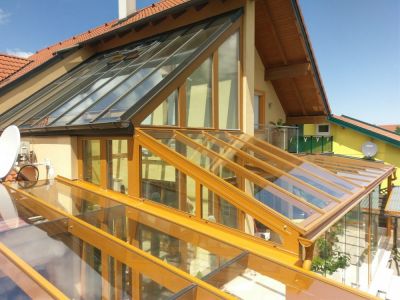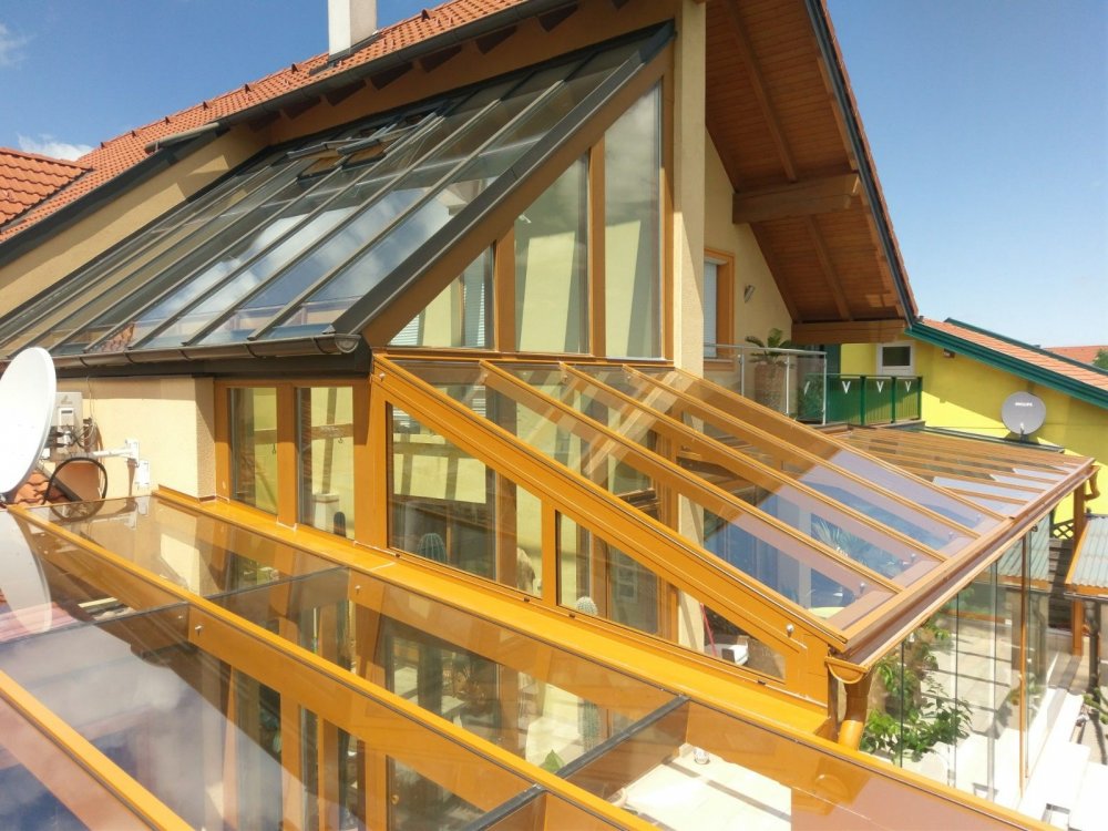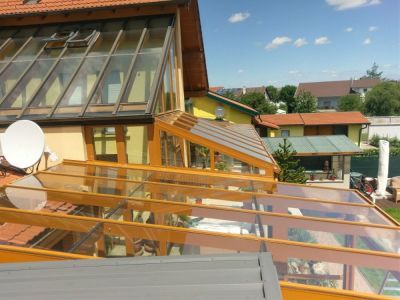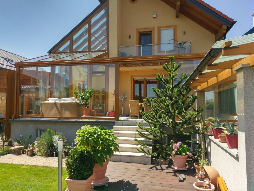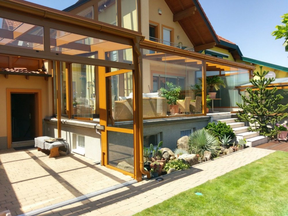 Spezielle Form? Für uns kein Problem. Diese Konstruktion ist eine Kombination von einem Sommergarten mit nurglas Schiebetüren und von eine Übedachung. .
