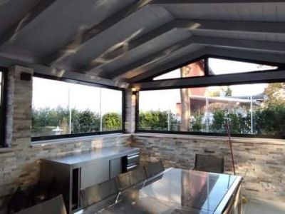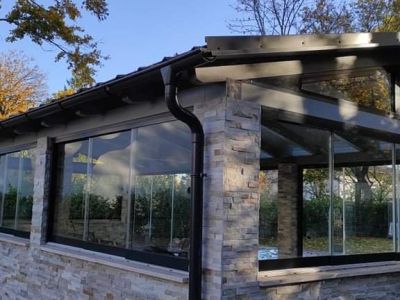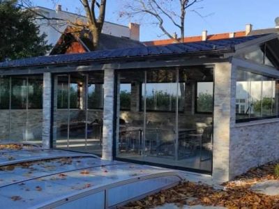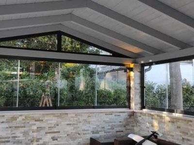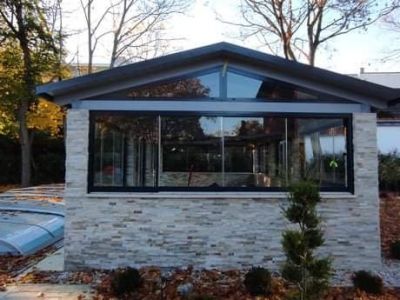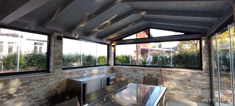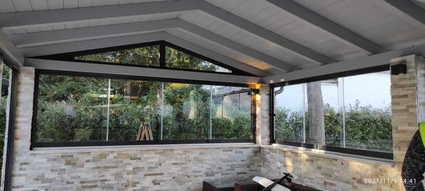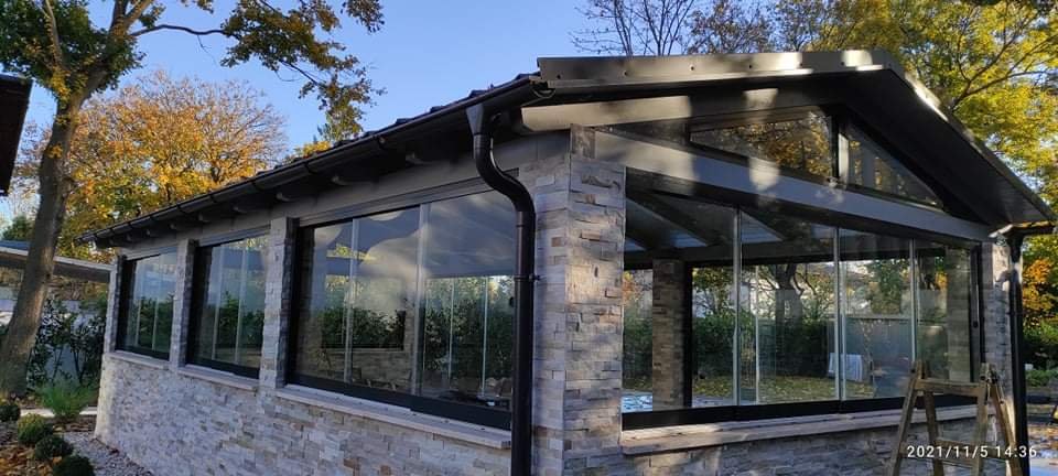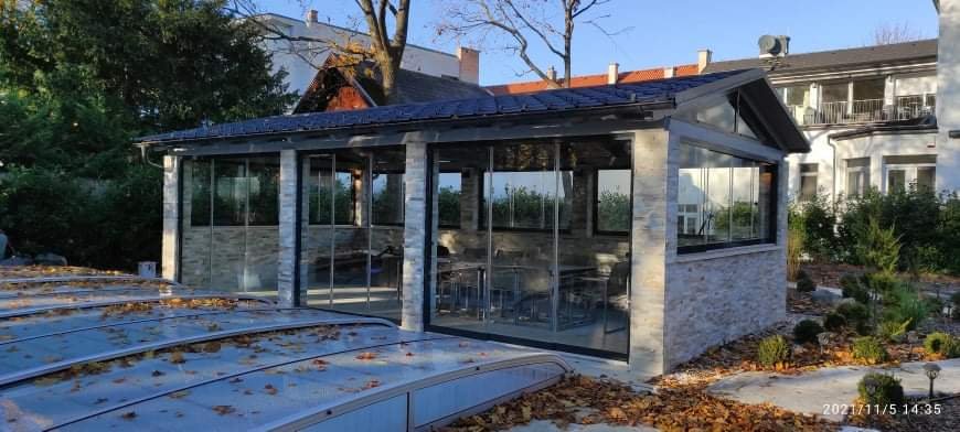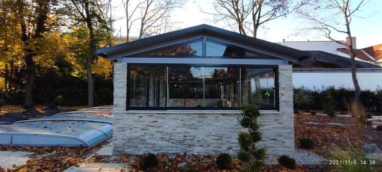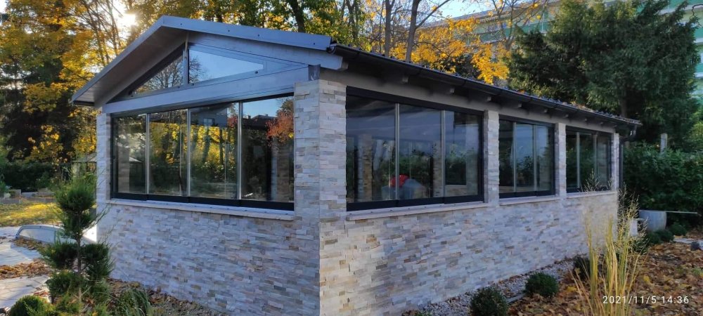 Spezielle Konstruktionen? Für uns auch kein Problem. Dieser Kunde hat uns aufgesucht damit wir den bereits fertigen Gartenhaus mit diversen Elementen versehen. Fixverglasungen in eckigen Formen deren Grad bereits bestimmt war wegen der vorhandenen Dachneigung . Auf die Seiten wurden nurglas Schiebeanlagen eingebaut die dank der mehrschienigen Ausführung bei Bedarf eine offene Fläche sichern. So kann der Kunde trotz schlechtem Wetter die Gebäude benutzen. Alle Elemente wurden aus pulverbeschichtetem Aluminium Profilen hergestellt mit Sicherheitsverglasung. Mit unserem Nurglas Schiebe Anlagen können Sie diverse Gebäuden,Terassen ,Balkon abschließen.
