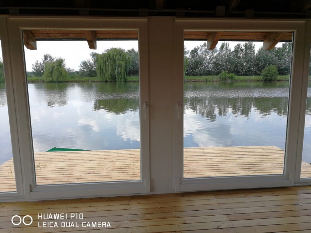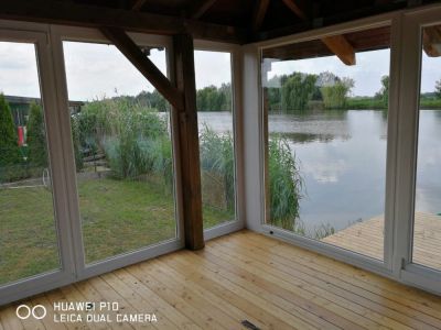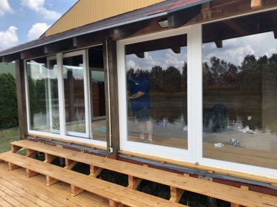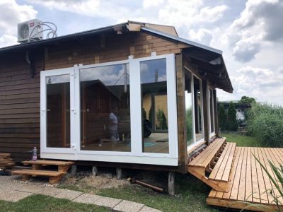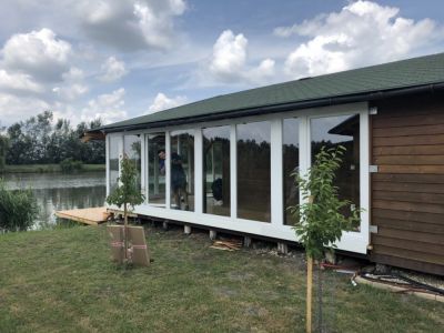 Terassenverbau mit weiße Kunstoff Elemente, bei den Front mit Schiebe-Kipp Türen.
