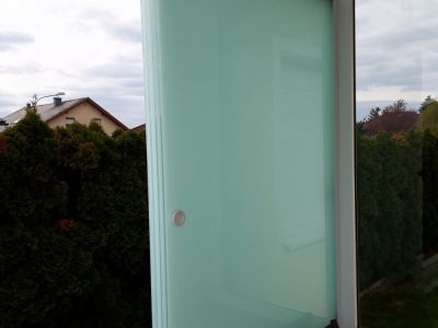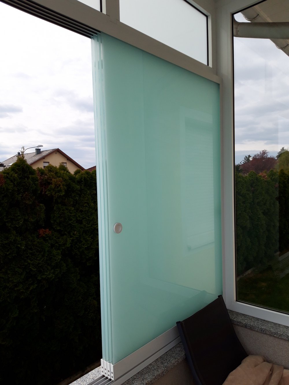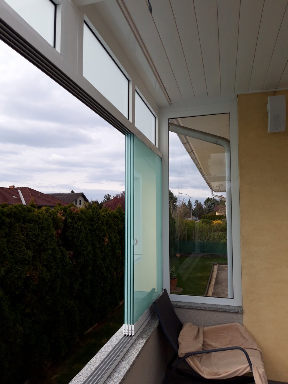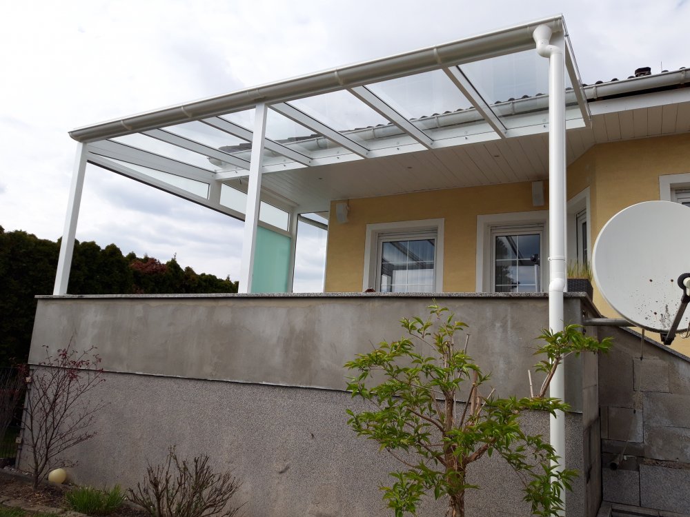 Bei dieser Auftrag war der Kundenwunsch eine Aluminium Überdachung in weisse Farbe. Auf eine Seite wurde als Windfang eine nurglas Schiebe Anlage geplant, die bei Bedarf ganz einfach zum öffnen oder zum schließen ist, dank der mehrschienigen Ausführung. Diese Schiebe Anlagen können entweder mit durchsichtiges Glas oder mit satinierten ausgeführt werden. Hier ist die Wahl auf die satinierte Version gefallen, damit im geschlossenen Zustand dies als auch ein Blickfang dient. Für die Ableitung vom Regenwasser wurde hier eine längere Dachrinne wegen der Ausführung der Überdachung installiert.
