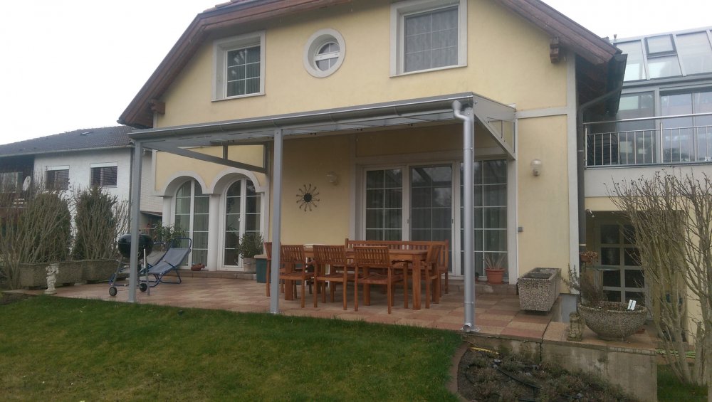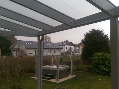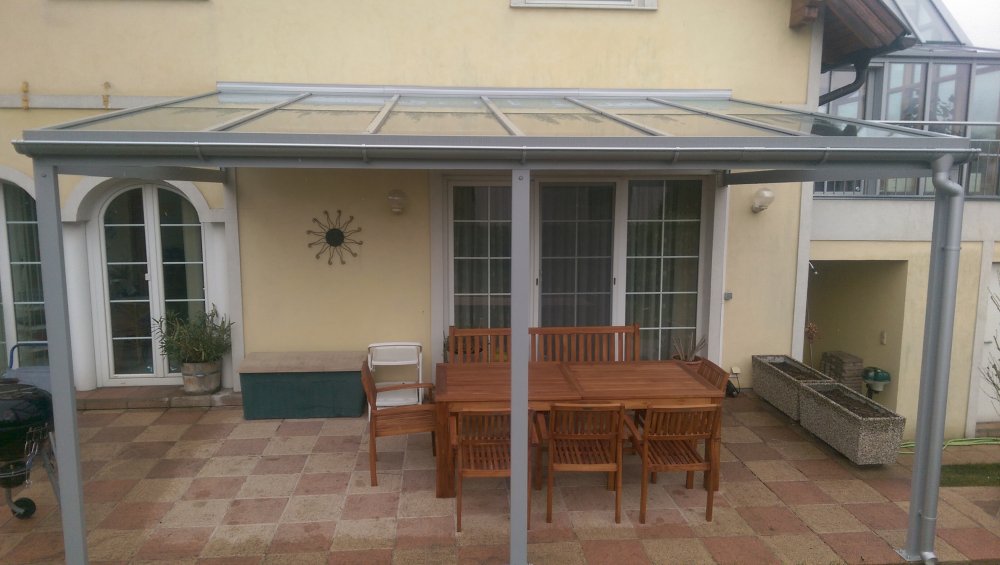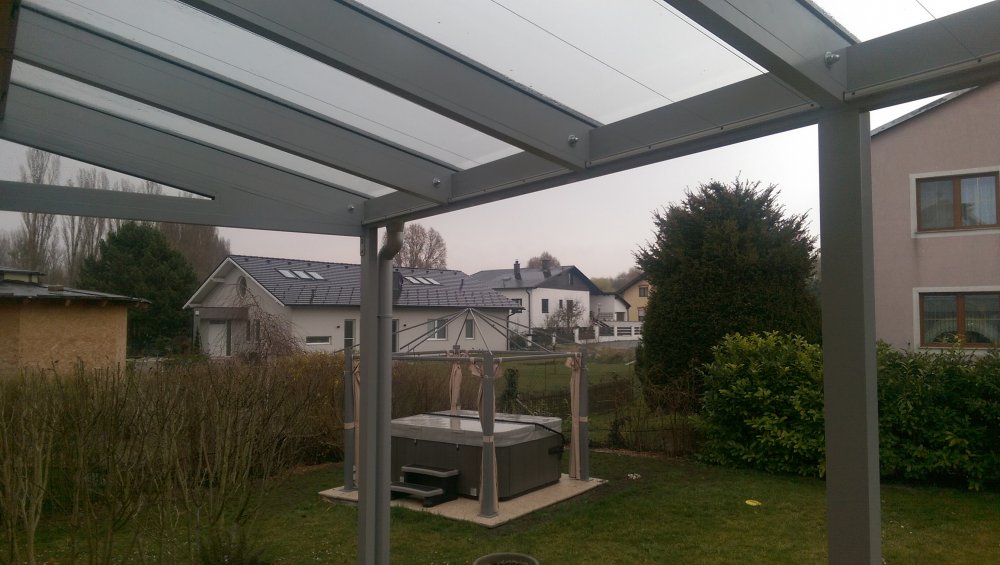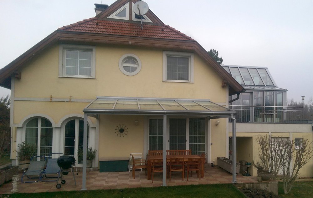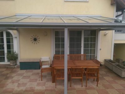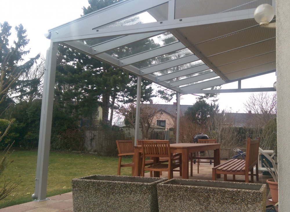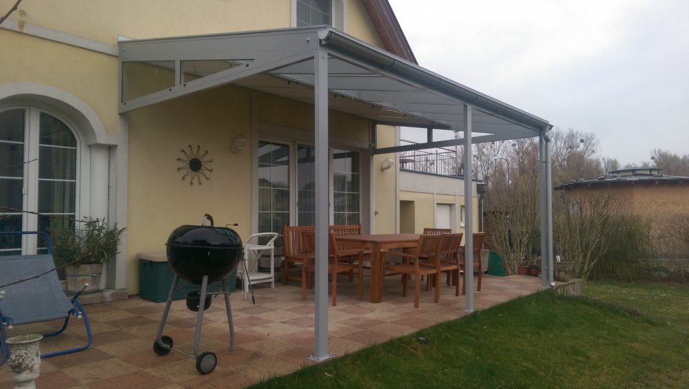 Terrassenüberdachung mit Plisee Dachbeschattung, Seitliche Oberlichte als Windschutz