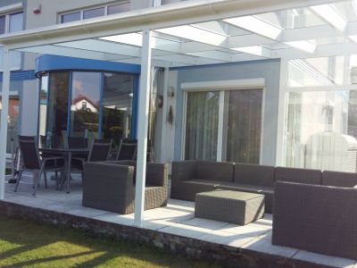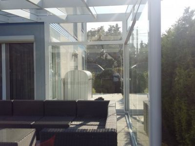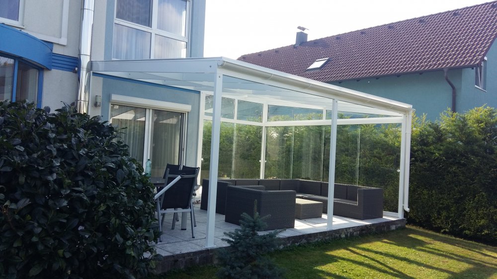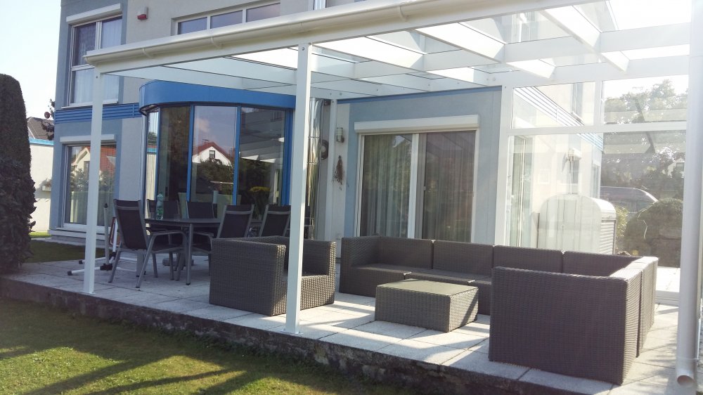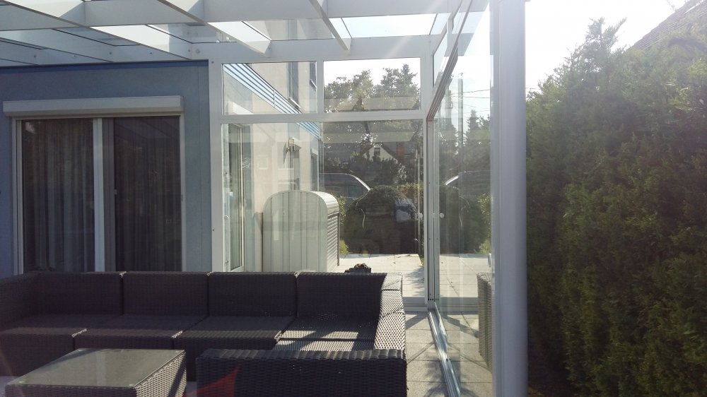 Aluminium Überdachung mit seitlichen Verglasung, Slide Glas Schiebe System für die windige Seite , damit die Überdachung bzw. die Terasse auch beim stärkeren Wind benutzt werden kann