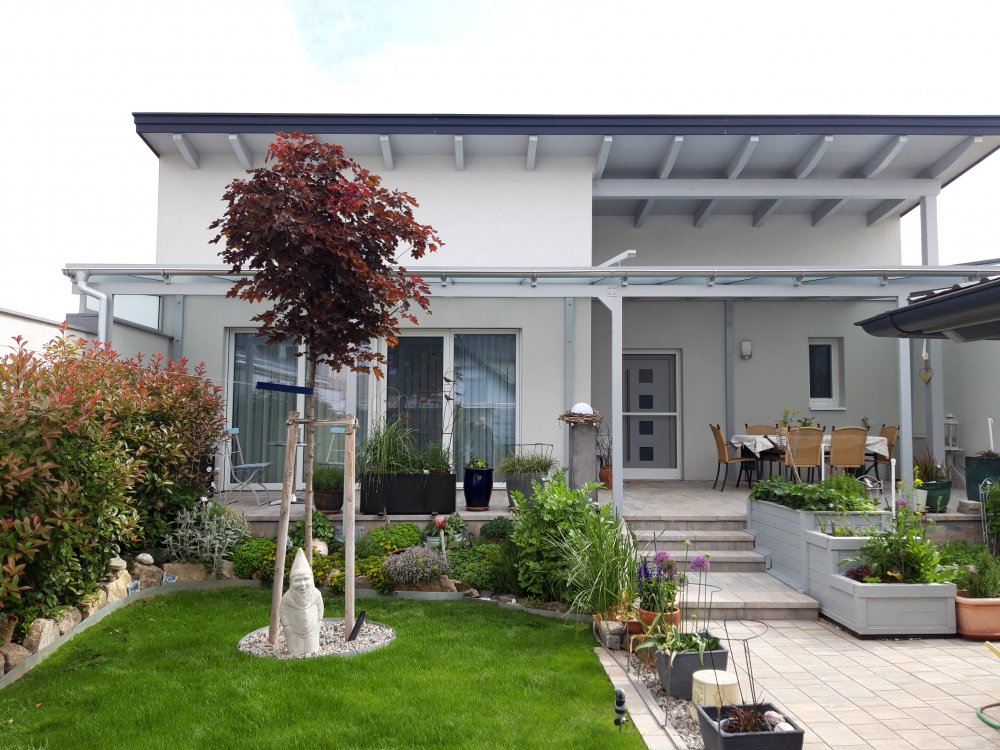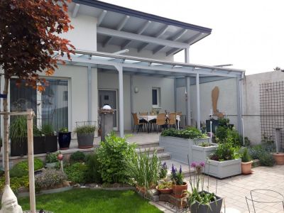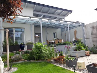 Eine klassische Überdachung ist eine gute Wahl für jede Terasse. Schützt gegen Regen und Schnee ,Sie können auch im Winter Ihre Gartenmöbel ruhig auf der Terasse lassen. Bei der Planung wurde die optimale Dachneigung nach der Maßabnahme erfasst und so kann unser Kunde sicher sein dass der Regenwasser abgeleitet wird. Laut Kundenwunsch wurden die Aluminium Profile auf eine weisse Farbe beschichtet so harmonisiert die Überdachung mit der Optik vom Haus und Garten . Ein großer Vorteil ist von diesen Konstruktionen, dass man dies in späteren sogar auf einem Sommergarten erweitern kann mit Glas-Schiebetüren.