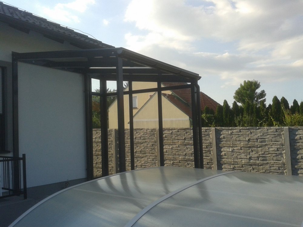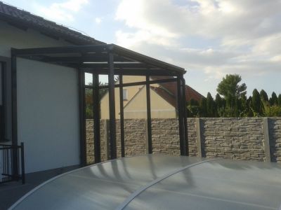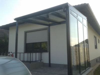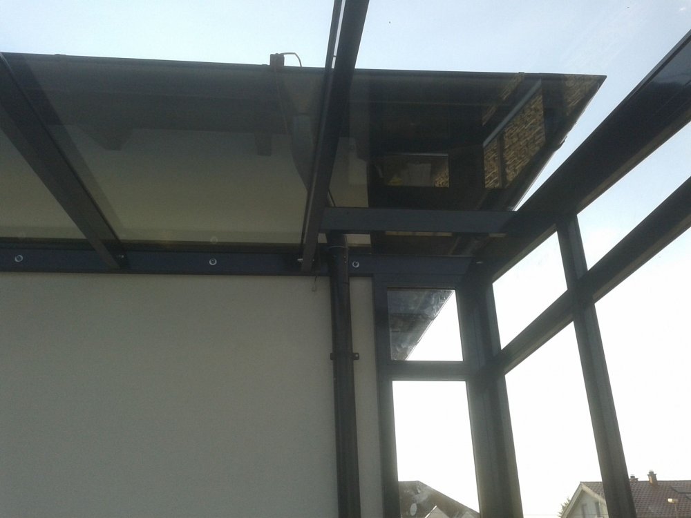Eine Überdachung im kleineren Format mit einem Aluminium Seitenteil für die windige Seite. So können SIe Ihre Terasse auch im schlechten Wetter benutzen. Bei dieser Terasse war eine spezielle Lösung für die Dachrinne vom Hausnotwendig. Dies konnten wir mit einem Glasauschnitt lösen.