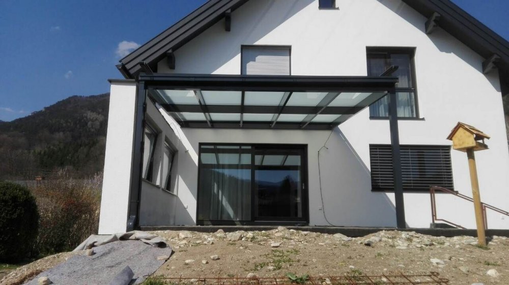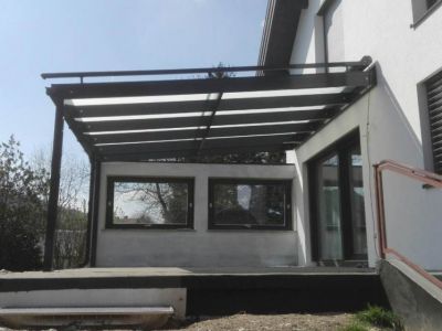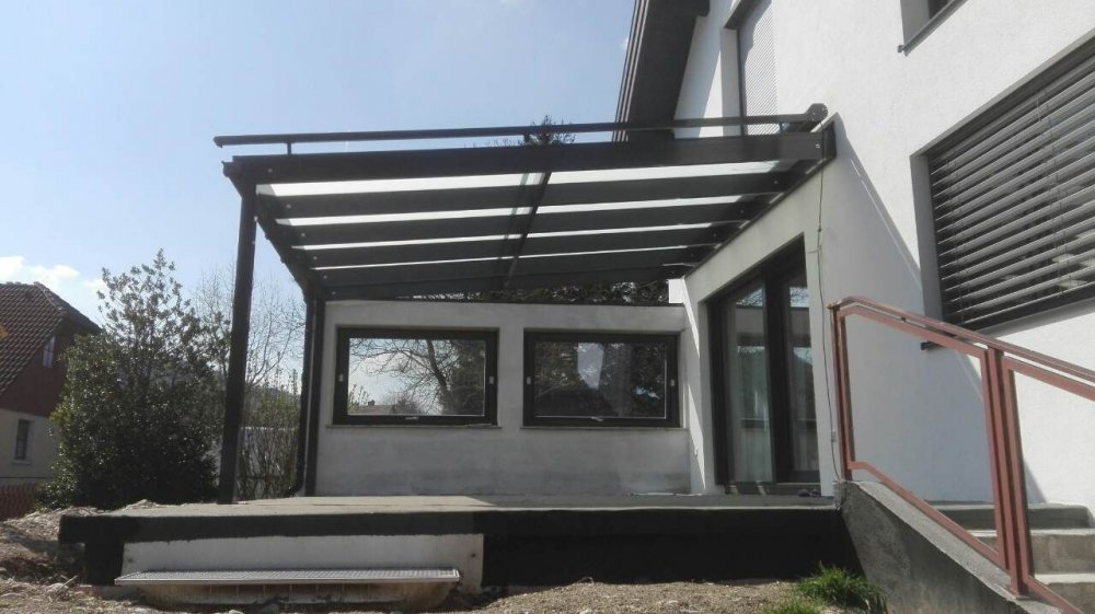Überdachung in Antrazitfarbe und Milchglas ist ein Blickfang . Damit die Terasse auch im Sommer benutzt werden kann hat sich unser Kunde noch für eine Markise entschieden,