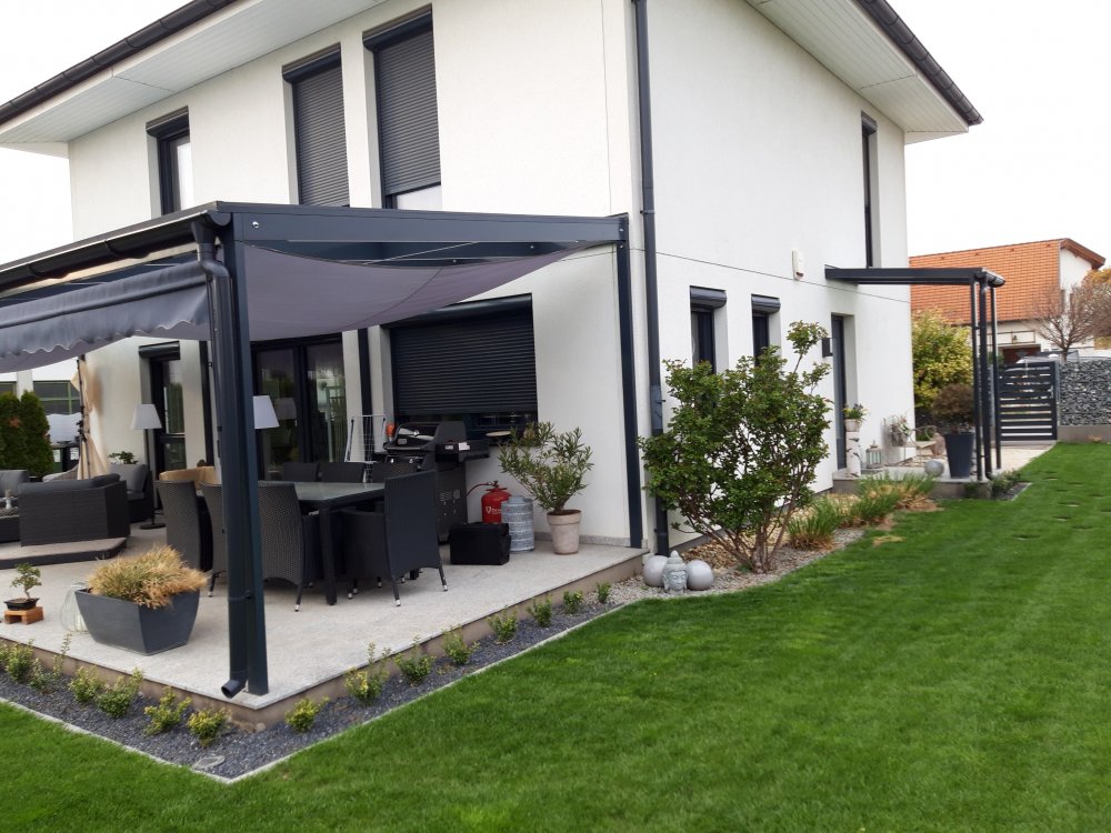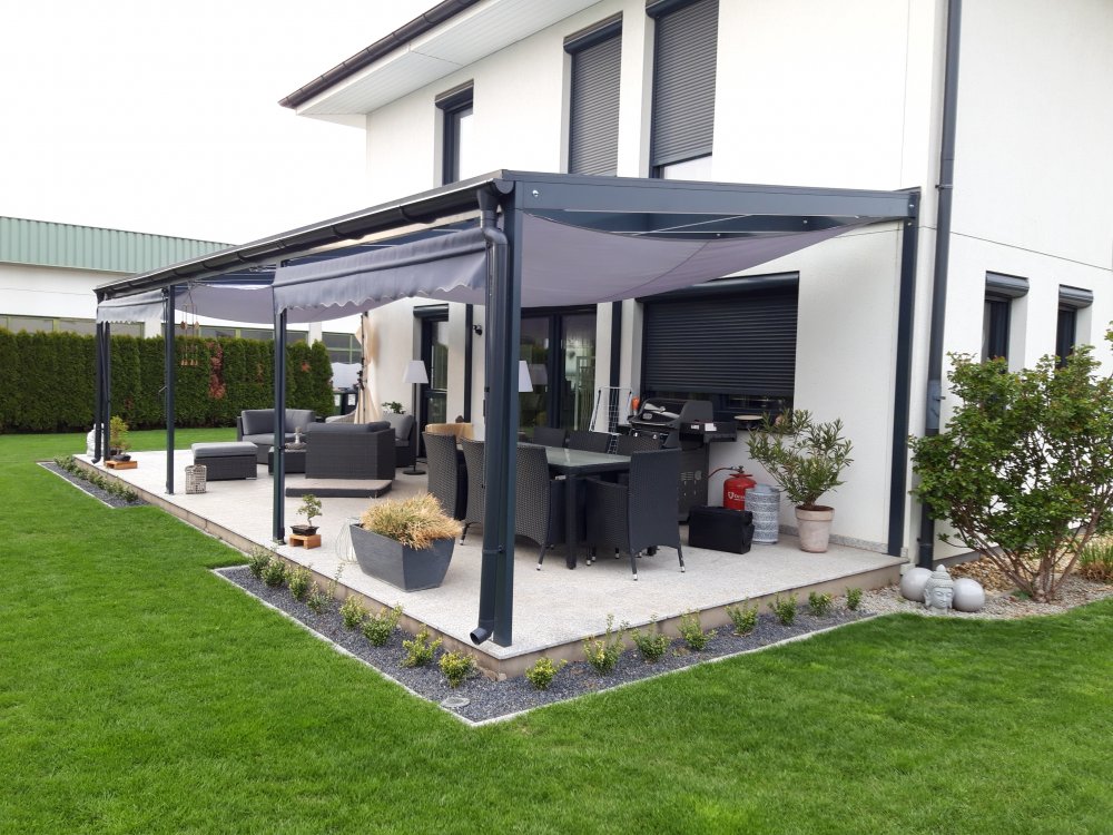 Unser Auftraggeber hat zwei Überdachungen auf einmal bestellt. Eine kleinere Überdachung für den Eingangsbereich und eine Terassenüberdachung. Beide Konstruktionen wurden auf die moderne Antrazit Farbe beschichet. Wegen der Größe bzw. Breite der Terassenüberdachung waren mehrere Steher notwendig aus statischen Gründen. Aus dem Grund wurde auch bei dieser Auftrag eine gründliche Berechnung erstellt , damit sich unser Kunde in sicherheit fühlen kann. Als Beschattung wurde eine einfachere Form gewählt ein Sonnensegel die ganz einfach zu installieren ist.
