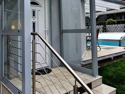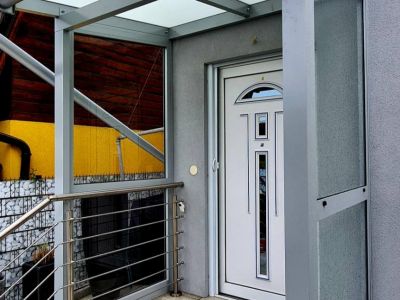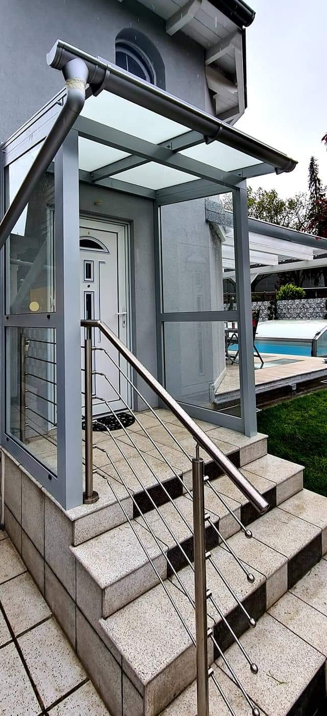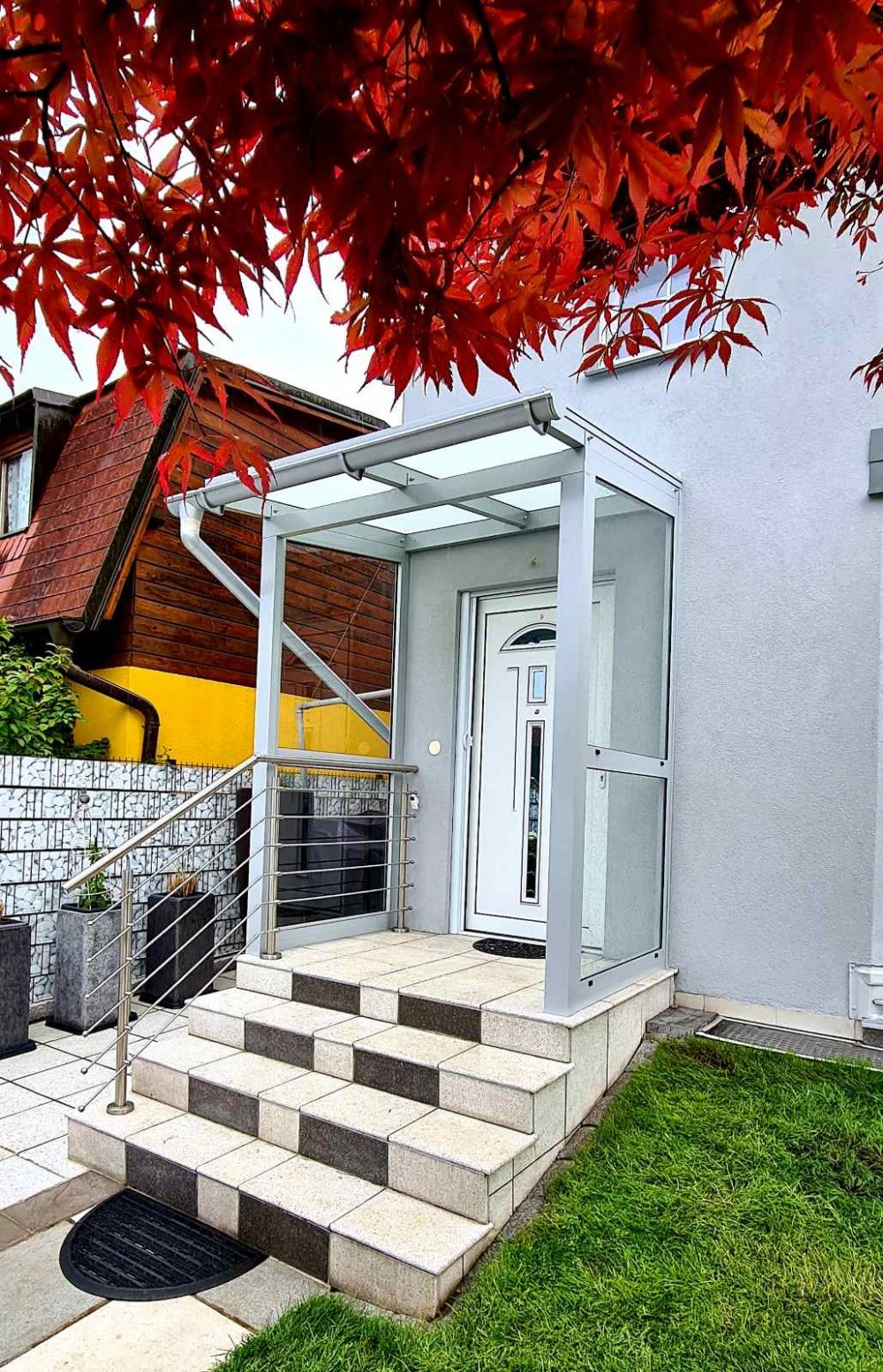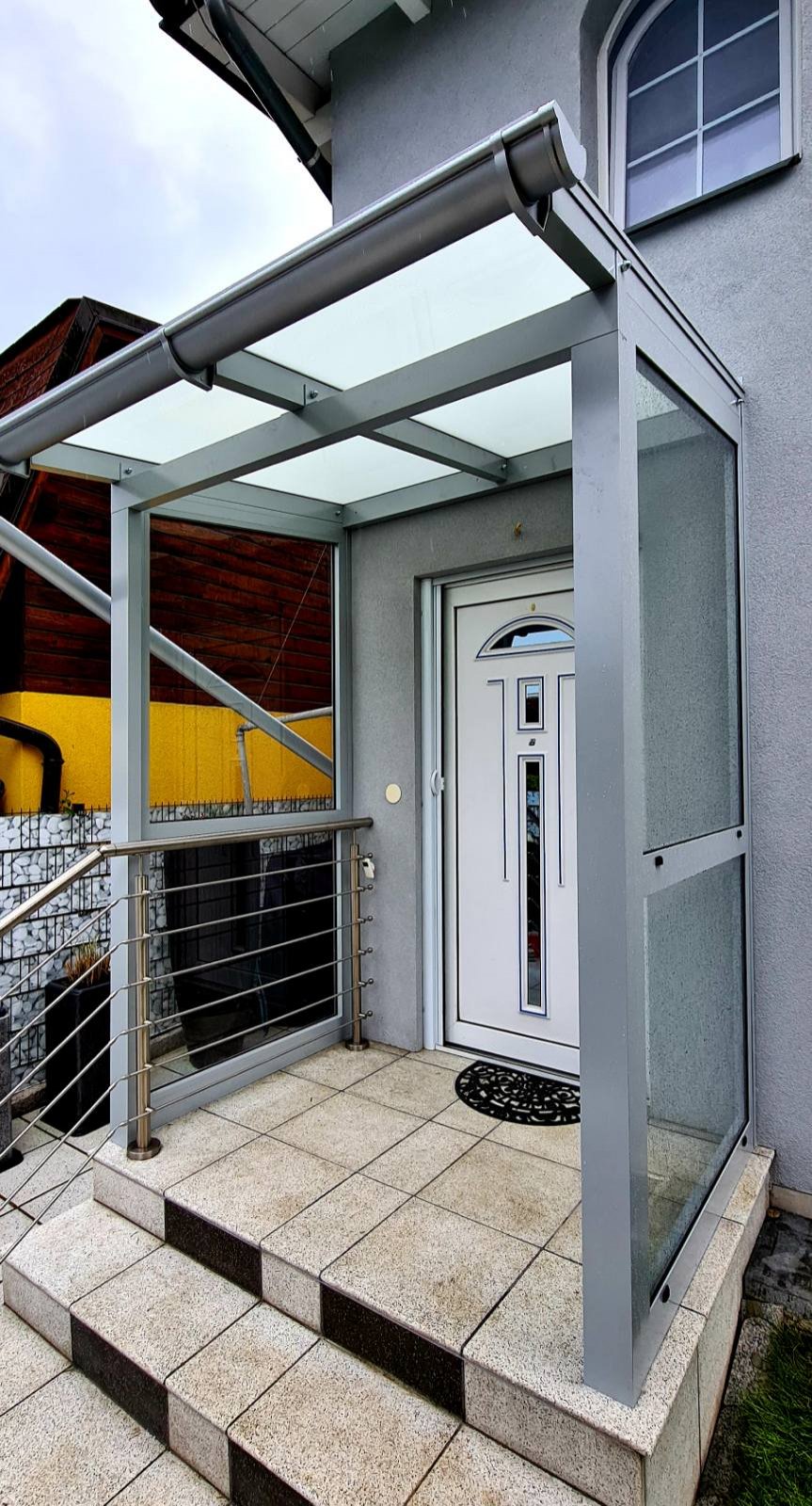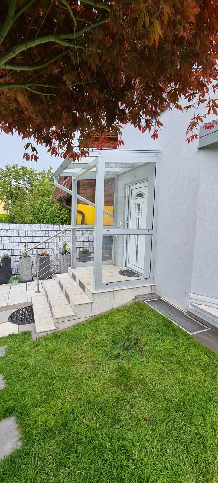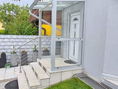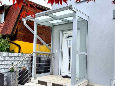 Bei dieser Auftrag war der Kundenwunsch die Verbau vom Eingansbereich, damit dies vor Wind und Regen geschützt ist. So hat unser Techniker ein Vordach aus Aluminium geplant und seitlich Aluminium Fixverglasungen. Die Verglasungen sind bei alle Elemente Sicherheitsverglasungen. Diese Art von einem Eingansverbau ist einfach und Effizient. Natürlich wurde auch hier eine Dachrinne eingebaut damit das Regenwasser abgeleitet werden kann.