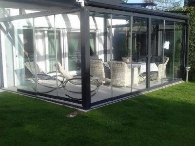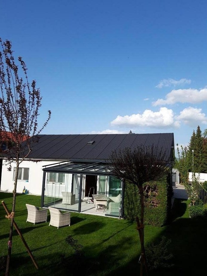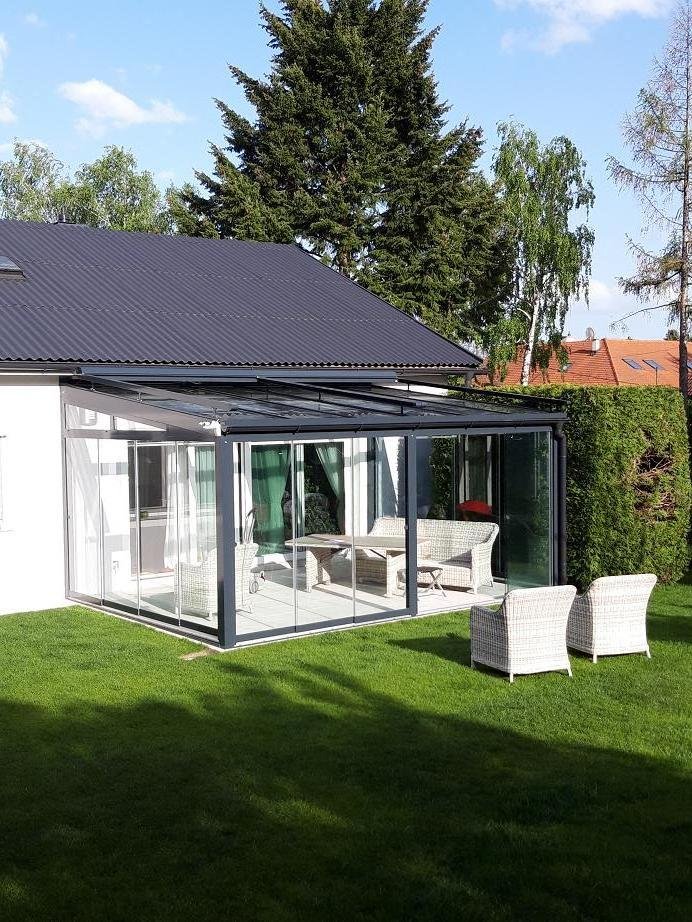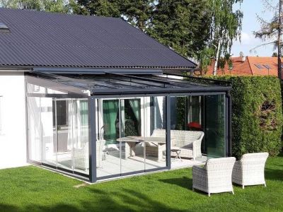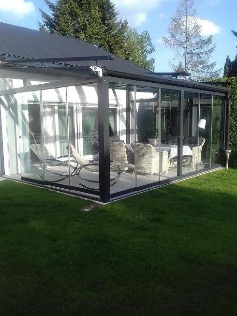 Alumínium nyárikert üvegtoló oldalrendszerrel, antrazitszürke színben.